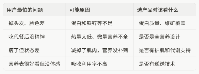 这是我后来越来越有感触的一点。有些代餐只是把热量压下去了,真正对身体有价值的蛋白、维矿、关键脂质和吸收效率,根本没跟上。所以用户一开始以为自己选的是“健康减脂”,到后面却常常变成“低卡但低质量”。